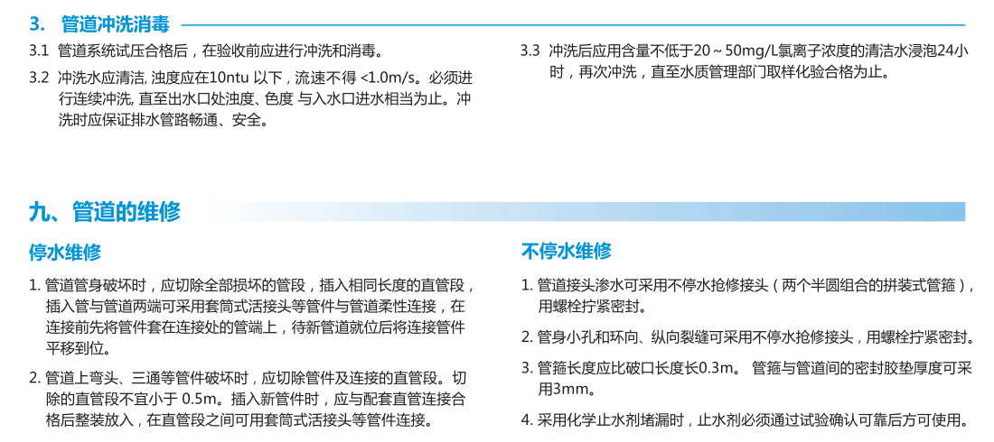 宜昌HDPE雙壁波紋管作為現(xiàn)代城市建設和基礎設施中的重要材料,因其優(yōu)良的耐腐蝕性、高強度、輕量化及良好的柔韌性,被廣泛應用于排水、排污、農(nóng)田灌溉及通信工程等領域。然而,為了確保其長期正常運行,定期的維護與保養(yǎng)顯得尤為重要。 首先,定期檢查是保養(yǎng)工作的基礎。應定期檢查管道表面是否有損壞、磨損或裂紋,特別是在管道連接處。同時,需檢查管道周圍是否有滲漏的水,一旦發(fā)現(xiàn)滲漏,應及時修復,防止問題擴大。此外...